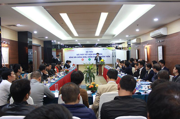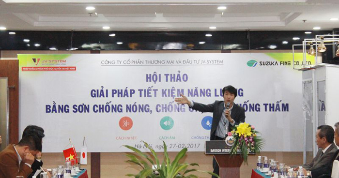 Vừa qua, tại khách sạn Bảo Sơn, JV-SYSTEM đã tổ chức thành công Hội thảo Giải pháp tiết kiệm năng lượng bằng sơn chống nóng, chống ồn, siêu chống thấm. Hội thảo có sự tham dự của đại diện nhà sản xuất Công ty Suzuka Fine - Nhật Bản và Công ty Cổ phần Thương mại và Đầu tư JV-SYSTEM cùng các đơn vị doanh nghiệp hoạt động trong lĩnh vực xây dựng tại Việt Nam.