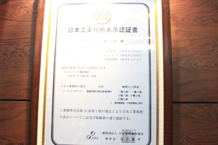 Suzuka Fine là nhà sản xuất sơn gốc đậm đặc, sơn giải pháp cho các công trình xây dựng lớn thứ 2 tại Nhật Bản, được Hiệp hội sơn Nhật Bản công nhân Công ty Nhật Bản được cấp giấy Chứng nhận tiêu chuẩn JIS K5675 (Sơn phản xạ ánh sáng mặt trời)