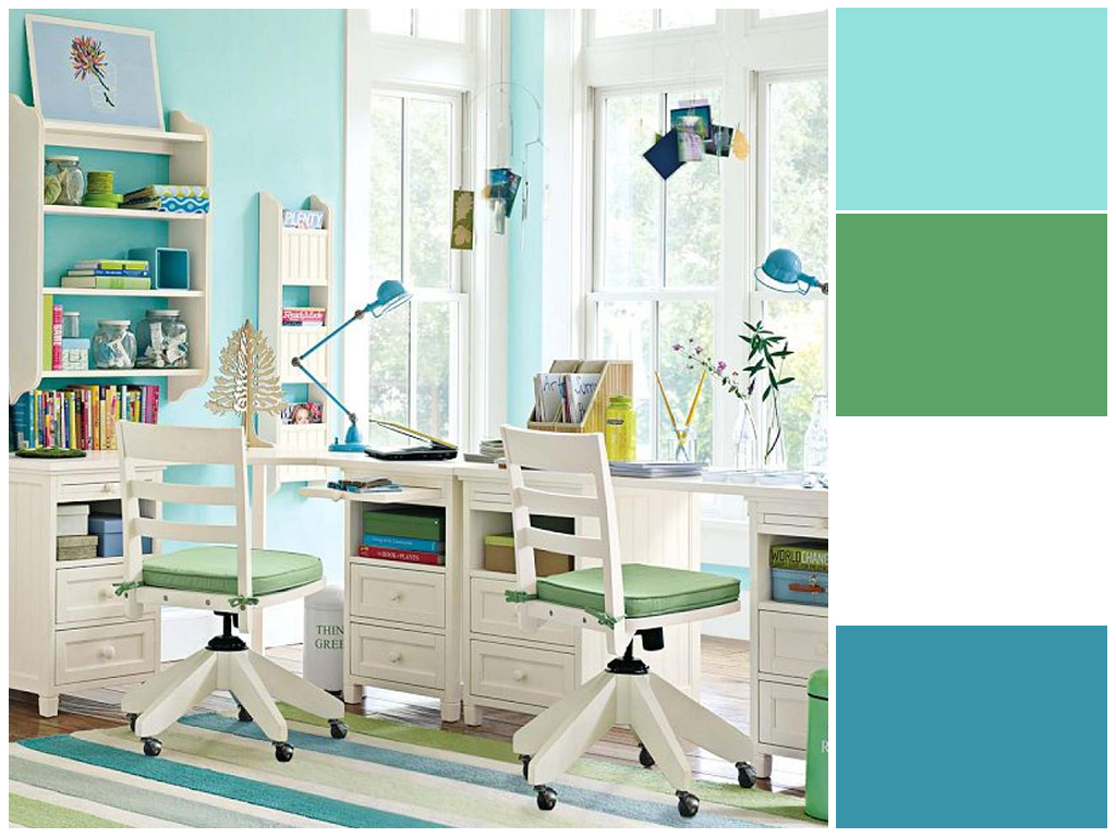 Như một luồng không khí mát mẻ, màu xanh da trời khi kết hợp với màu xanh lá sẽ tạo nên một không gian sáng tạo và truyền cảm hứng tuyệt vời. Không gian xanh trong phòng làm việc sẽ đem đến sự tươi mới, trẻ trung và kích thích khả năng làm việc của não bộ. Để hoàn thiện căn phòng, hãy kết hợp màu trắng sữa và màu xanh dương đậm để làm điểm nhấn cho không gian làm việc.