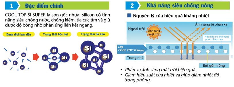 - Đặc điểm chính: COOL TOP SI SUPER là sơn gốc nhựa silicon có tính năng siêu chống nước, chống kiềm, tia cực tím và giữ được độ bóng nhờ phản ứng liên kết ngang,