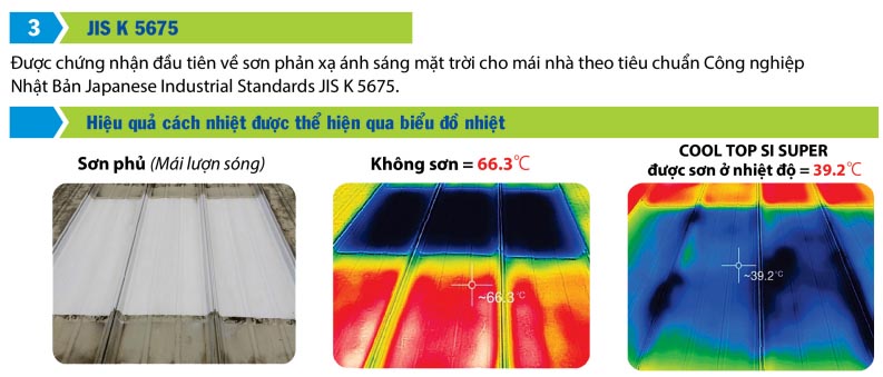 - Chứng chỉ JIS K 5675: Được chứng nhận đầu tiên về sơn phản xạ ánh sáng mặt trời cho mái nhà theo tiêu chuẩn Công nghiệp Nhật Bản Japanese Industrail Standards JIS K5675