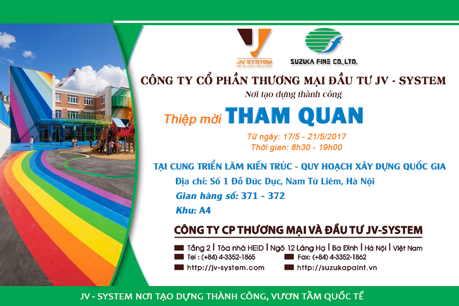 Nhằm giới thiệu về sơn SUZUKA - Dòng sơn cao cấp nhập khẩu trực tiếp từ Nhật Bản tới quý Khách hàng, Công ty Cổ phần Thương mại và Đầu tư JV-SYSTEM xin gửi tới quý vị thư mời tham quan gian hàng " SƠN SUZUKA - GIẢI PHÁP TIẾT KIỆM NĂNG LƯỢNG BẰNG SƠN CHỐNG NÓNG, CHỐNG ỒN, SIÊU CHỐNG THẤM". chi tiết như sau: